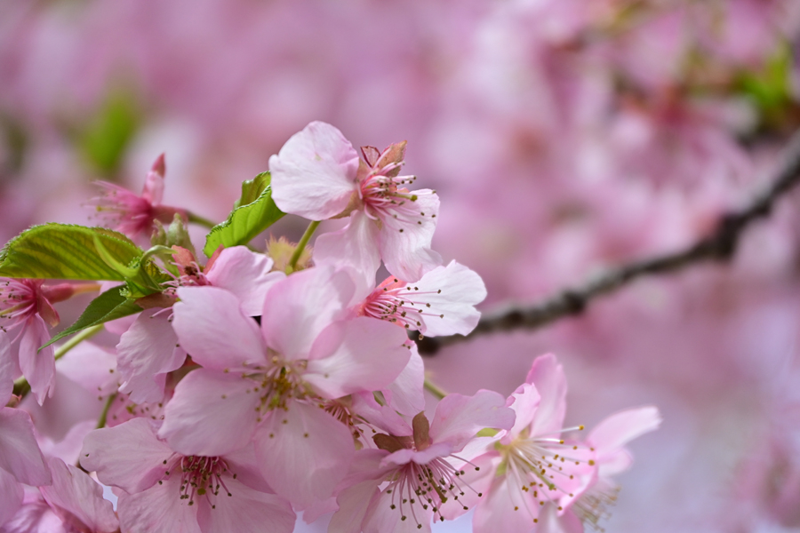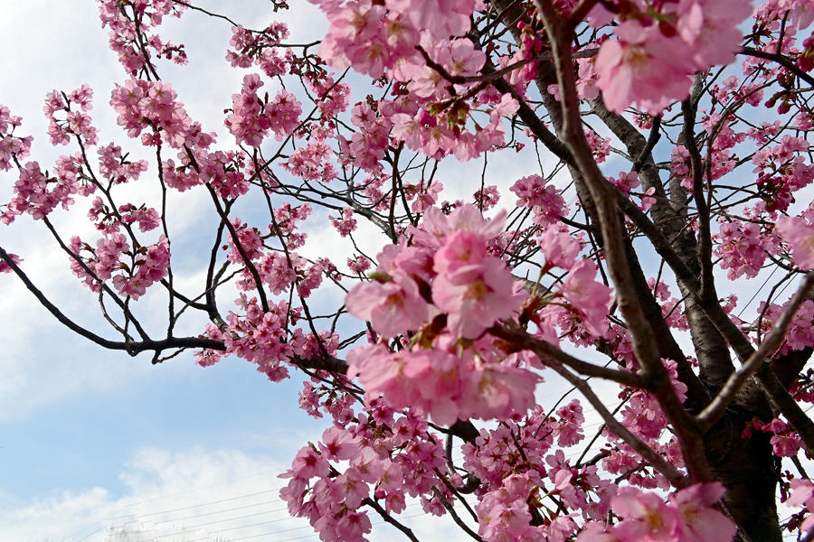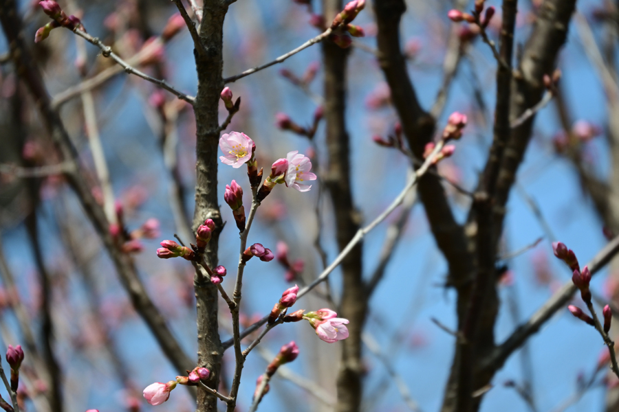 ソメイヨシノに比べて色が濃く、はっきりとしている。花びらは先端がわずかにくぼんだハート型で、丸みがあるり、やや大きめで存在感がある。開花時期は2月上旬〜3月初旬だが、今年の開花は少し遅かった。今年は今が満開だ。ひなが比較的長く楽しめるのも特徴だ。