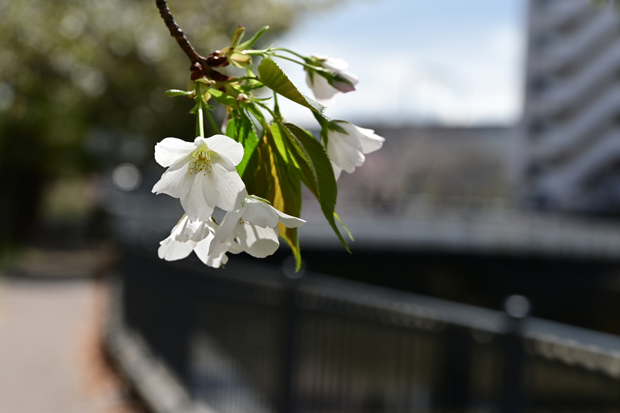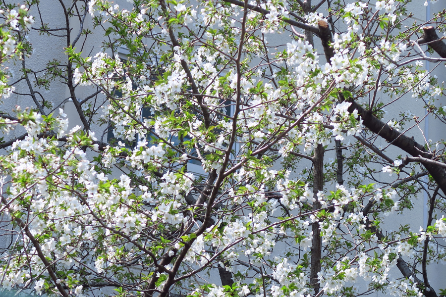小学校の敷地の裏手で毎年咲くヤマザクラはまず葉を出し、そして白い花を咲かせる。開花もソメイヨシノより早いが、遅くまで咲いている。