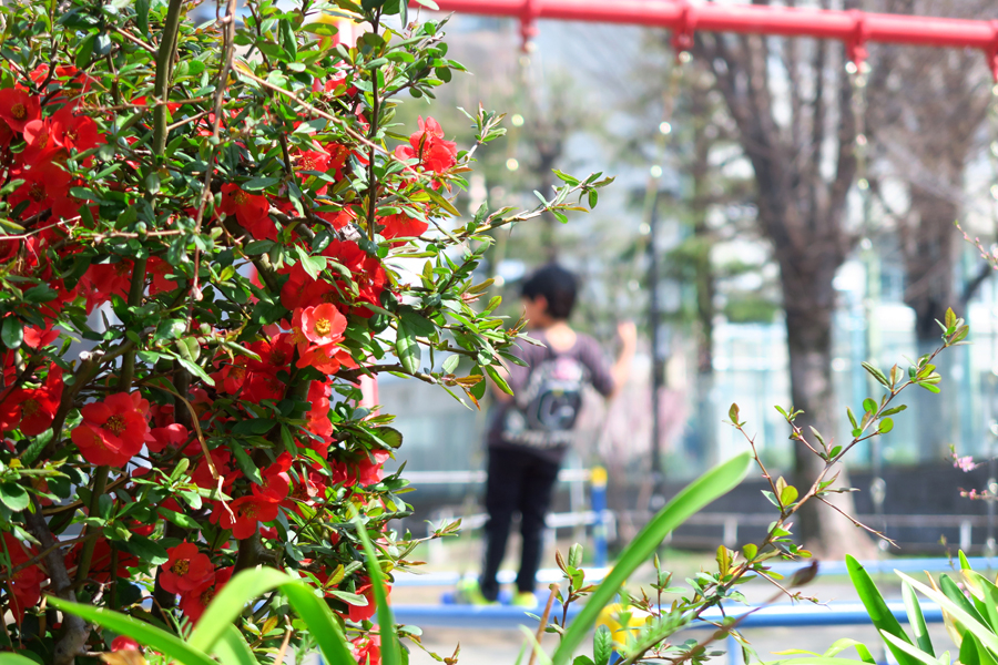 小さな公園のグランドの反対側には、住んでいらっしゃる方々が手入れしていいる花壇があるが、ボケが綺麗に咲いていた。別名をシドミというらしい。
