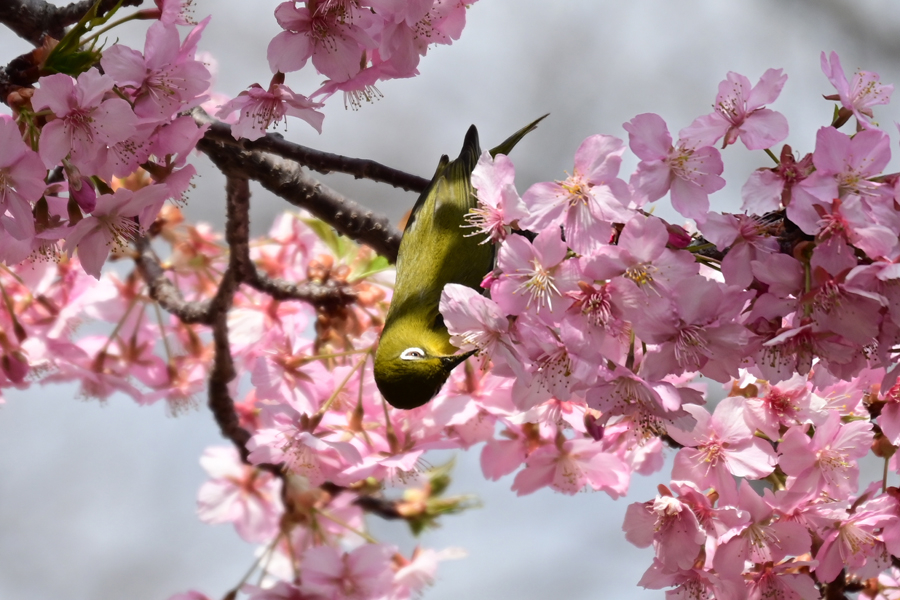メジロが数頭まとまって、カワヅザクラの花に飛来し吸蜜をする。人の動きに驚いてか1羽が飛び立つと、一斉にみんな飛び立ってしまう。しばらくするとまたやってきた。ちょっとピントが甘いが、画像に2羽を取り込めた。